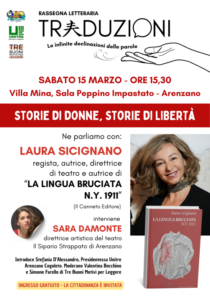 Sabato 15 marzo, ore 15,30, nella sala Peppino Impastato di Villa Mina, ad Arenzano, parleremo di storie di donne e storie di libertà con “La lingua bruciata. N. Y. 1911” di Laura Sicignano, regista, autrice e direttrice di teatro, edito da Il Canneto nel 2024.