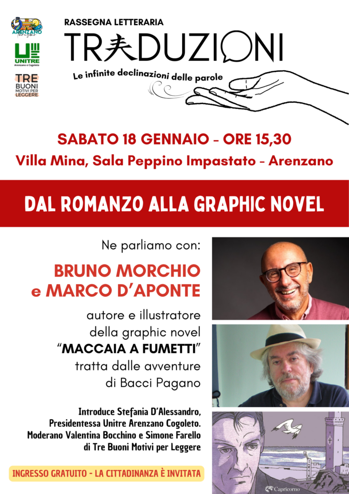 Sabato 18 gennaio 2025 alle 15,30 nella sala Peppino Impastato di Villa Mina (in via Zunino, ad Arenzano) si parlerà della speciale “traduzione” dalla scrittura al disegno con due ospiti speciali: l’autore Bruno Morchio, premio Scerbanenco 2023, e l’illustratore Marco D’Aponte che hanno curato la graphic novel “Maccaia a fumetti” (Edizioni del Capricorno, 2024), tratta dal romanzo di Morchio “Maccaia” (Fratelli Frilli, 2012).