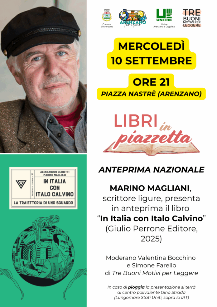 Mercoledì 10 settembre, alle ore 21, in piazza Nastrè ad Arenzano, appuntamento speciale fuori programma della rassegna letteraria “Libri in Piazzetta” organizzata dal blog Tre Buoni Motivi per Leggere e da Unitre Arenzano Cogoleto, con il patrocinio del Comune di Arenzano. L’ospite della serata sarà Marino Magliani, scrittore ligure, candidato all’edizione 2022 del Premio Strega e voce tra le più riconosciute della narrativa contemporanea, autore de “In Italia con Italo Calvino” (Giulio Perrone Editore, in uscita il 19 settembre) scritto con Alesandro Gianetti. Sarà l’occasione per presentare il libro in anteprima nazionale.