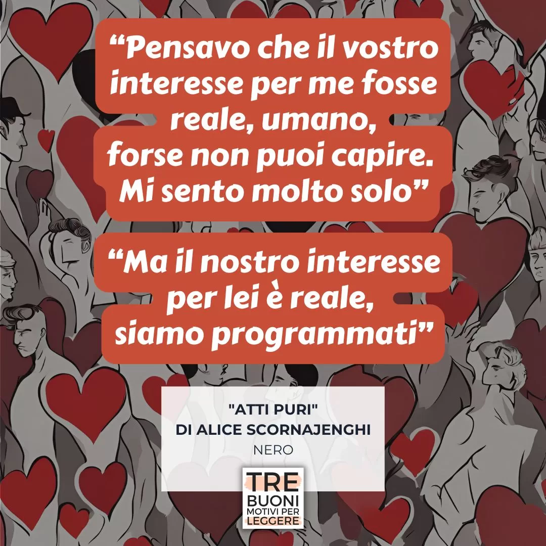 Oggi cambiamo totalmente genere: “Atti puri” di Alice Scornajenghi (Nero, 2023) l’avevo adocchiato l’anno scorso al salone Più Libri Più Liberi di Roma e l’avevo subito preso. Sono sei racconti porno, sì, ma particolari (potrei dire “porno weird) e ad attirarmi è stato il genere combinato alla casa editrice: chi ha già letto libri editi da Nero sa cosa può aspettarsi e cosa non deve aspettarsi.