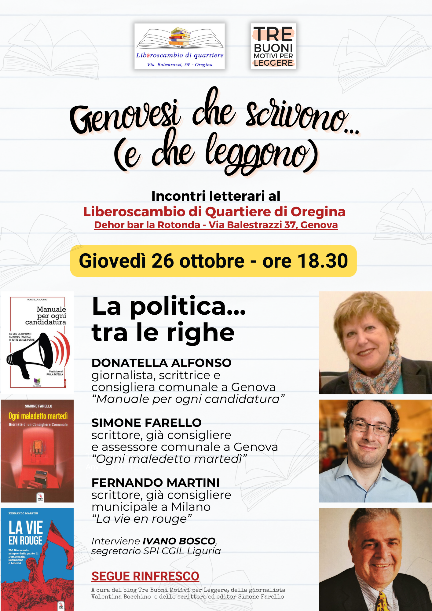Siamo lieti di presentare la nostra prima rassegna letteraria, in collaborazione con Liberoscambio di quartiere di Oregina. Appuntamento presso il dehor del bar La Rotonda di via Balestrazzi 37 con autrici e autori, parleremo dei loro libri, di attualità e poi… brinderemo tutti insieme!