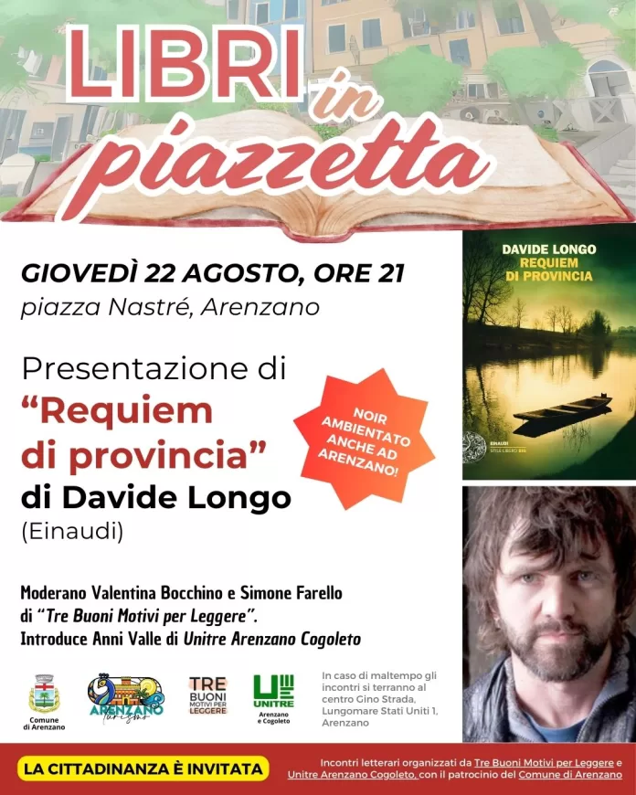 Per l’ultimo appuntamento di “Libri in piazzetta” – rassegna letteraria che organizziamo insieme a Unitre Arenzano Cogoleto e con il patrocinio del Comune di Arenzano . arriva uno scrittore molto conosciuto: Davide Longo con “Requiem di provincia” (Einaudi). E nel suo noir compare anche Arenzano!