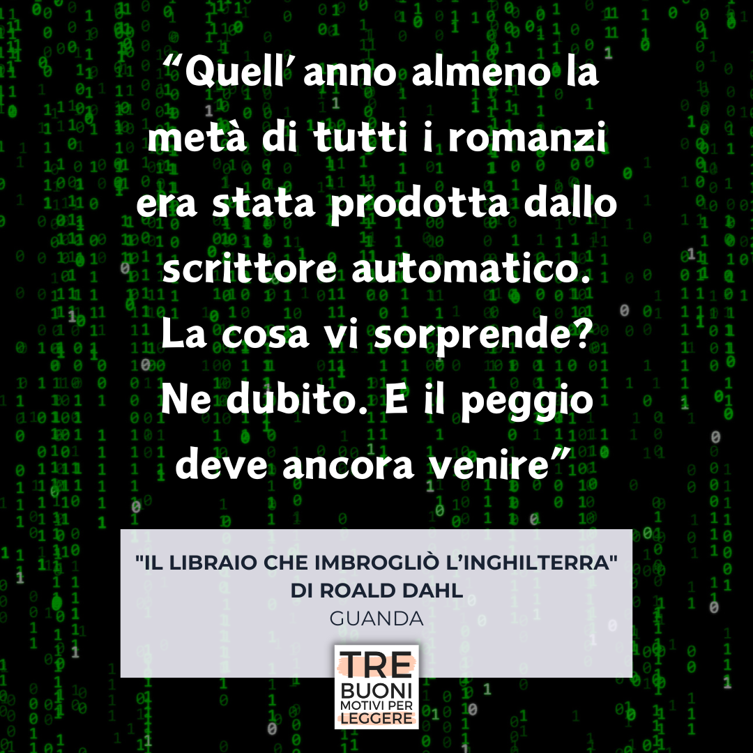 3 In un momento in cui si parla tanto di intelligenza artificiale generativa di testi come ChatGpt, Google Gemini e altri, ho trovato il secondo racconto terribilmente attuale. Lo scritto di Dahl è straordinariamente profetico: una macchina in grado di generare racconti (e poi romanzi) impostando alcuni parametri iniziali come il genere, il numero dei protagonisti, l’ambientazione e così via. Dahl aveva immaginato una cosa ai suoi tempi incredibile, fantascientifica, volutamente esagerata. Praticamente l’intelligenza artificiale, prima dell’intelligenza artificiale. Oggi il racconto sembra tecnicamente superato, ma i quesiti etici e morali sono sempre gli stessi.