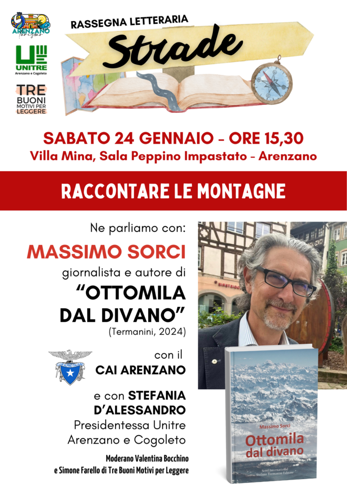 Torna la nostra rassegna letteraria ad Arenzano: iniziamo sabato 24 gennaio alle 15,30 nella cornice di sala Peppino Impastato di Villa Mina, in via Zunino, con il giornalista e scrittore Massimo Sorci, autore di “Ottomila dal divano” (Stefano Termanini Editore, 2024).