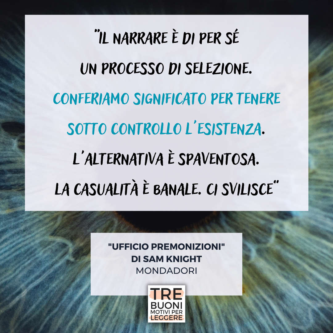 “Ufficio premonizioni” parla della forza della suggestione, e quindi parla della forza delle storie. Un fatto può essere vero se non lo raccontiamo? E se lo raccontiamo, rimane vero? Oggi che l’invasività dello storytelling e la difficoltà di distinguere l’autentico dal falso – nelle notizie ma non solo – possiamo imparare molto da un libro come quello di Sam Knight che raccontandoci, benissimo, una storia che inizia come un reportage e finisce come un romanzo del mistero. Del resto è proprio lì, nella zona del crepuscolo, che abitano i nostri sogni e i nostri fantasmi.